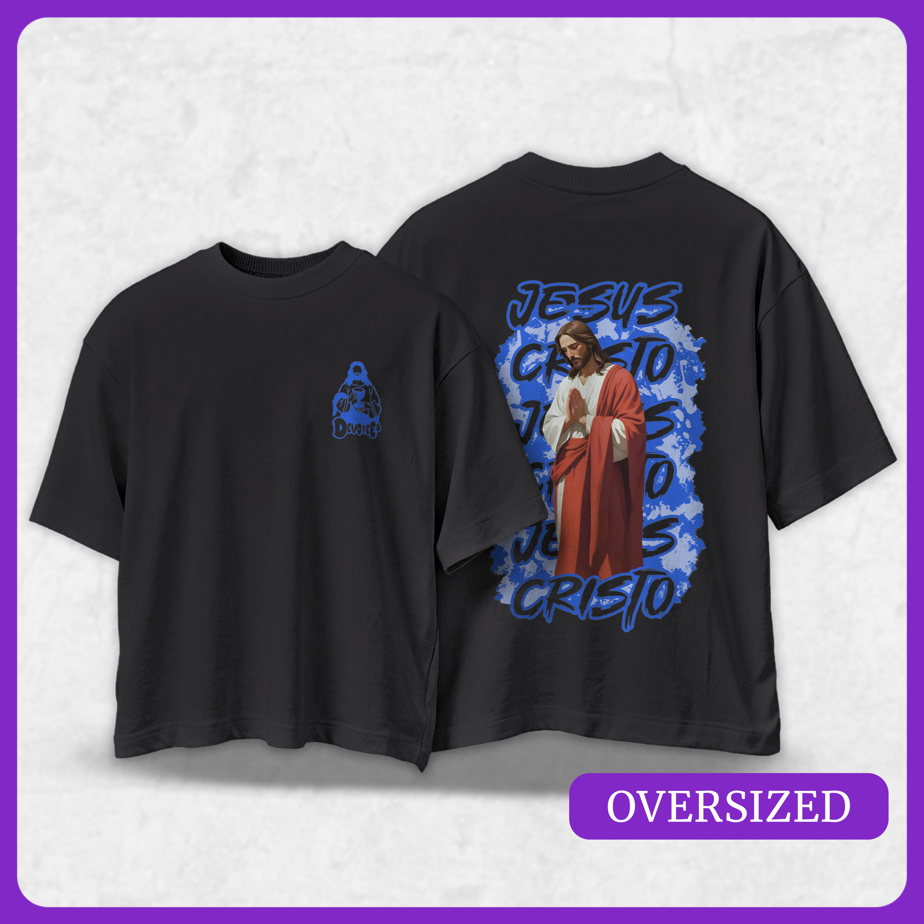 A estampa traz um fundo caótico de texturas e manchas de tinta, enquanto no centro a imagem de Jesus permanece intacta, mostrando que o sagrado habita e permanece inabalável mesmo diante do caos urbano. A cor Azul destaca a Contemplação e o Silêncio, convidando à paz que só o sagrado traz em meio à pressa da cidade.