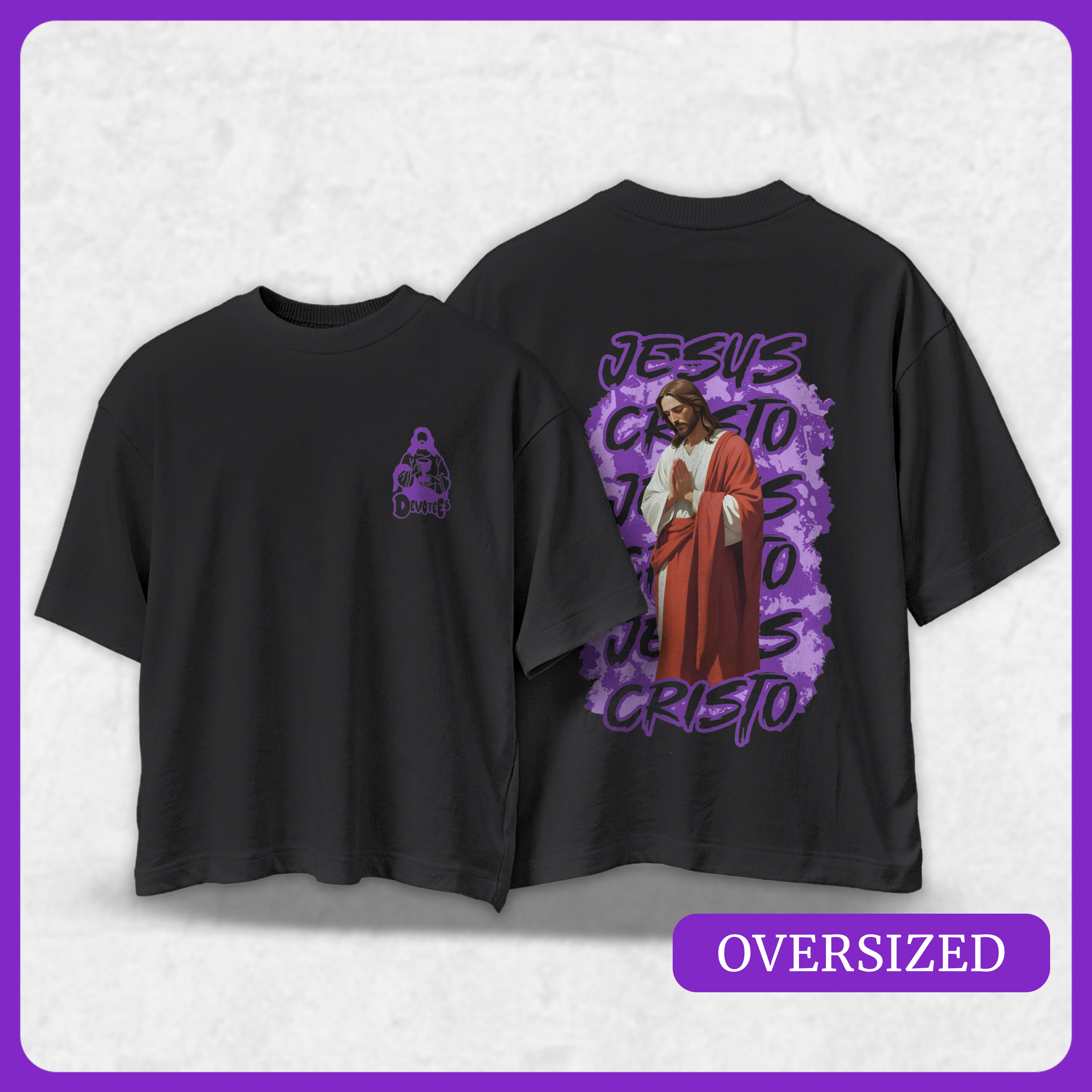 A estampa traz um fundo caótico de texturas e manchas de tinta, enquanto no centro a imagem de Jesus permanece intacta, mostrando que o sagrado habita e permanece inabalável mesmo diante do caos urbano. A cor roxa destaca essa Realeza e Transcendência, lembrando que você vive para algo maior.