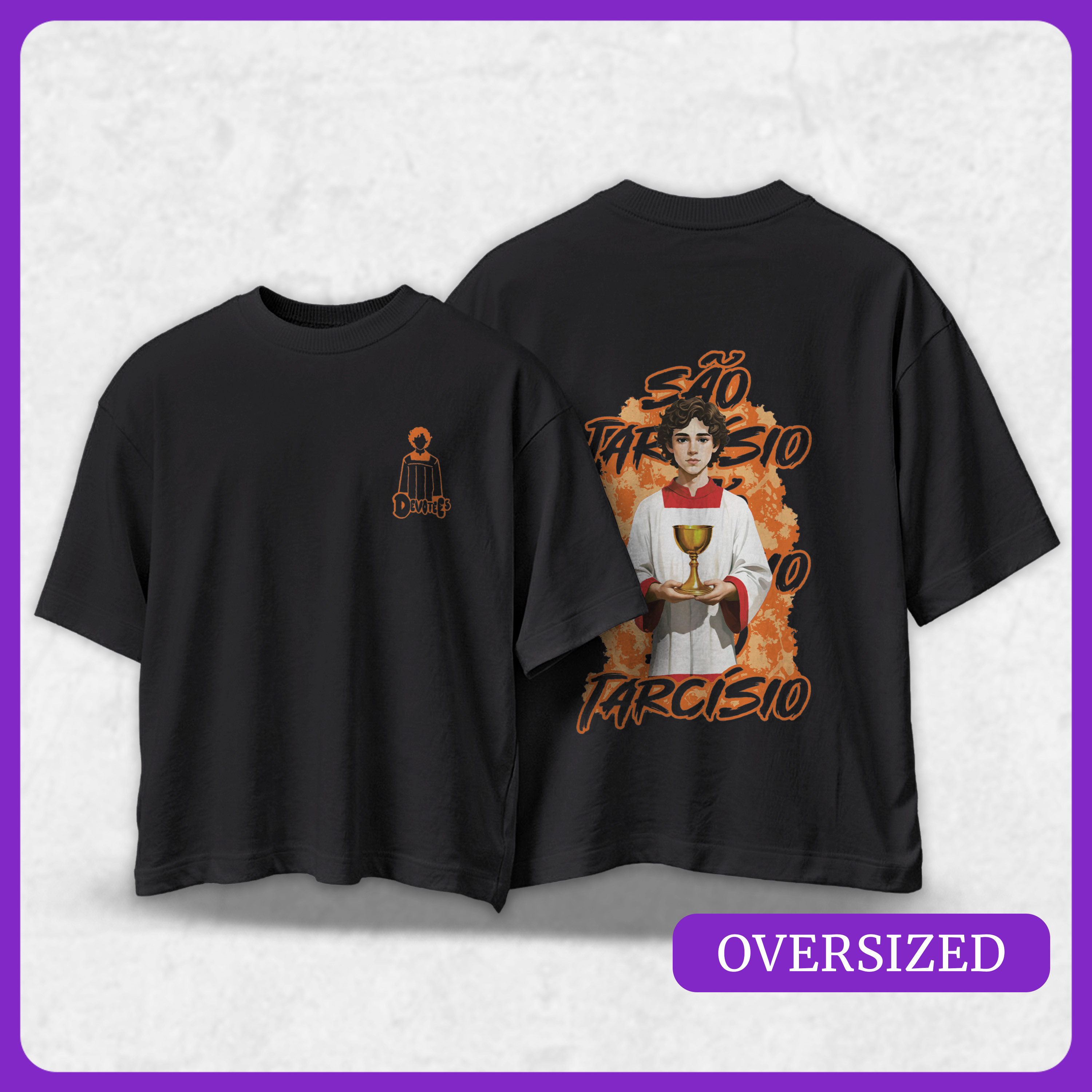 A estampa traz um fundo caótico de texturas e manchas de tinta, enquanto no centro a imagem de São Tarcísio permanece intacta, mostrando que o sagrado habita e permanece inabalável mesmo diante do caos urbano. A cor Laranja destaca a Ação e a Fé Viva, representando a energia de quem manifesta sua crença através do movimento e da atitude.