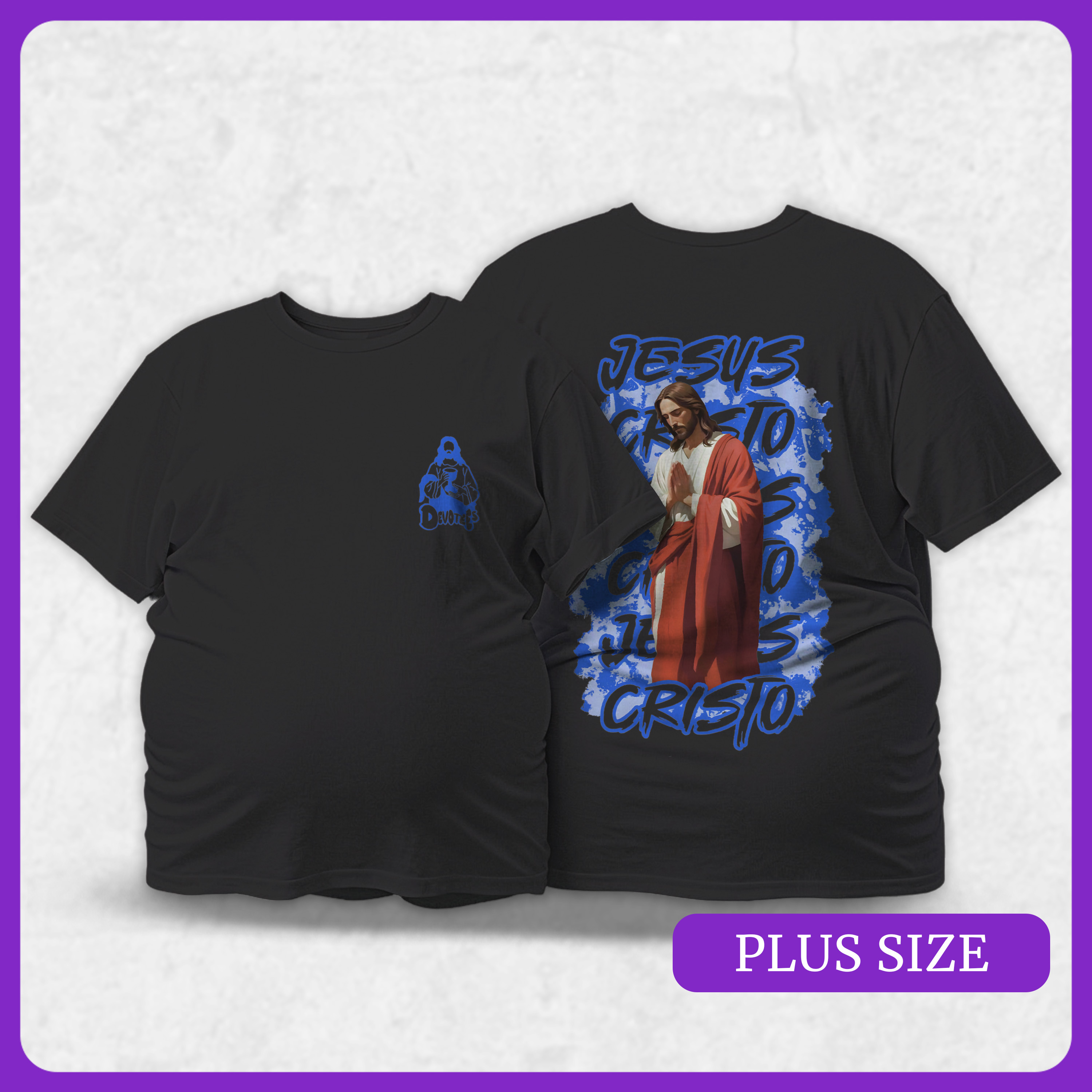 A estampa traz um fundo caótico de texturas e manchas de tinta, enquanto no centro a imagem de Jesus permanece intacta, mostrando que o sagrado habita e permanece inabalável mesmo diante do caos urbano. A cor Azul destaca a Contemplação e o Silêncio, convidando à paz que só o sagrado traz em meio à pressa da cidade.