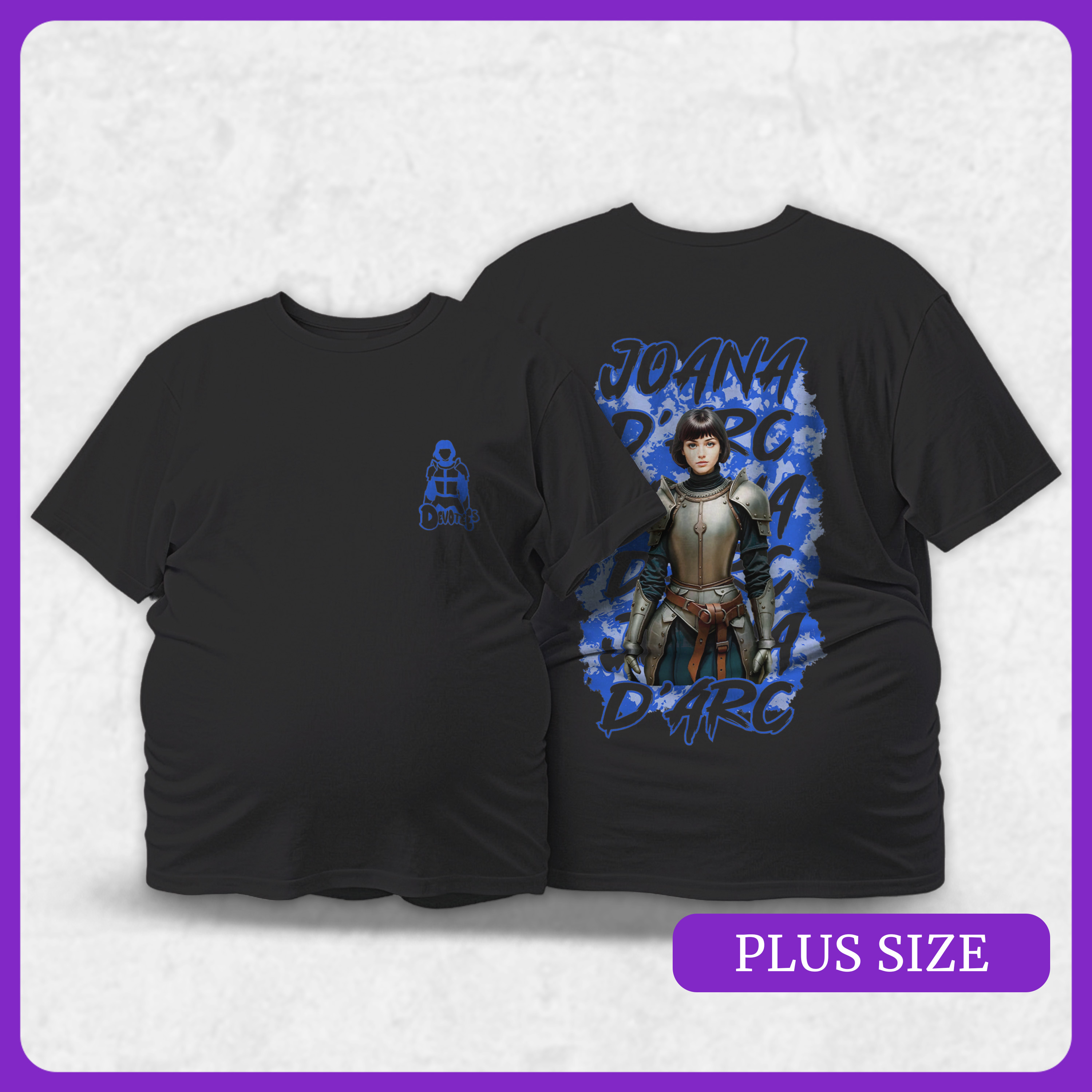 A estampa traz um fundo caótico de texturas e manchas de tinta, enquanto no centro a imagem de Joana D’arc permanece intacta, mostrando que o sagrado habita e permanece inabalável mesmo diante do caos urbano. A cor Azul destaca a Contemplação e o Silêncio, convidando à paz que só o sagrado traz em meio à pressa da cidade.