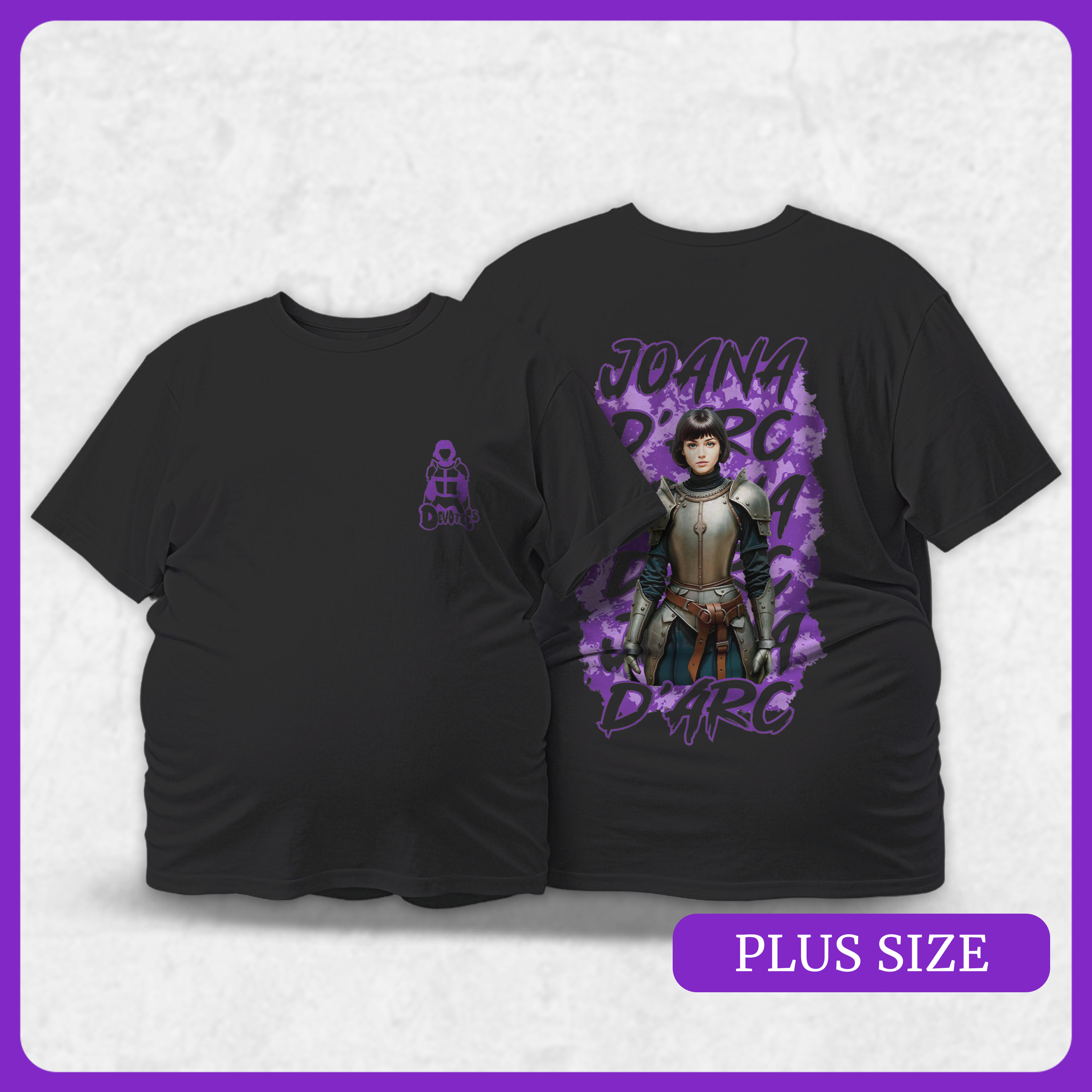 A estampa traz um fundo caótico de texturas e manchas de tinta, enquanto no centro a imagem de Joana D’arc permanece intacta, mostrando que o sagrado habita e permanece inabalável mesmo diante do caos urbano. A cor roxa destaca essa Realeza e Transcendência, lembrando que você vive para algo maior.