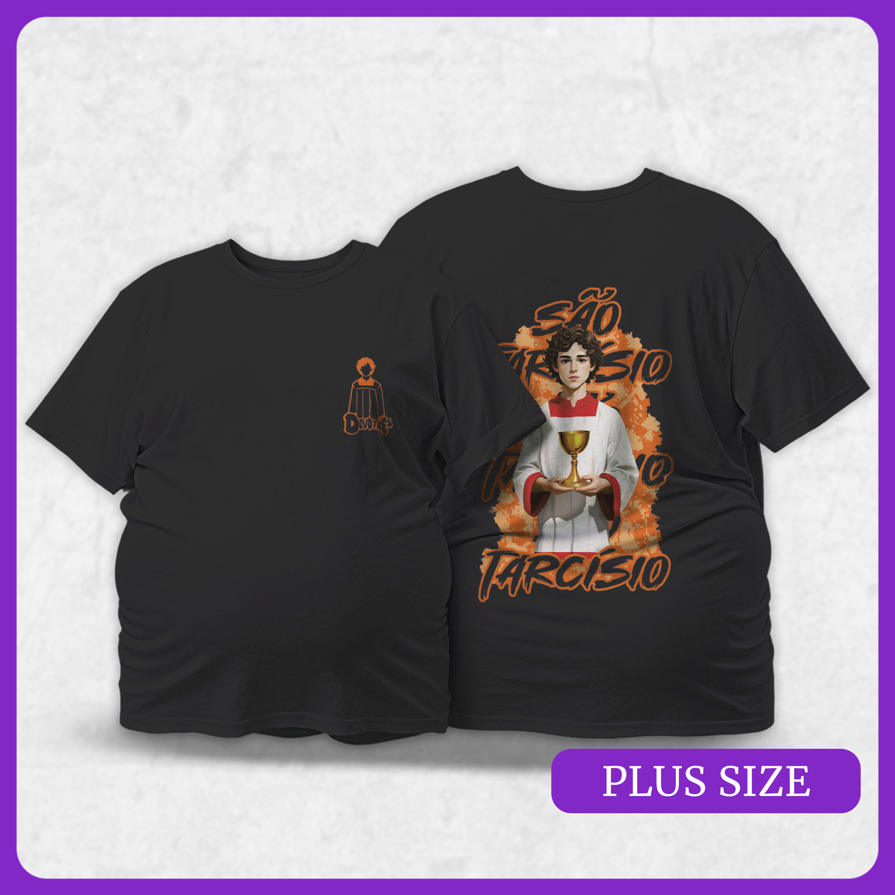 A estampa traz um fundo caótico de texturas e manchas de tinta, enquanto no centro a imagem de São Tarcísio permanece intacta, mostrando que o sagrado habita e permanece inabalável mesmo diante do caos urbano. A cor Laranja destaca a Ação e a Fé Viva, representando a energia de quem manifesta sua crença através do movimento e da atitude.