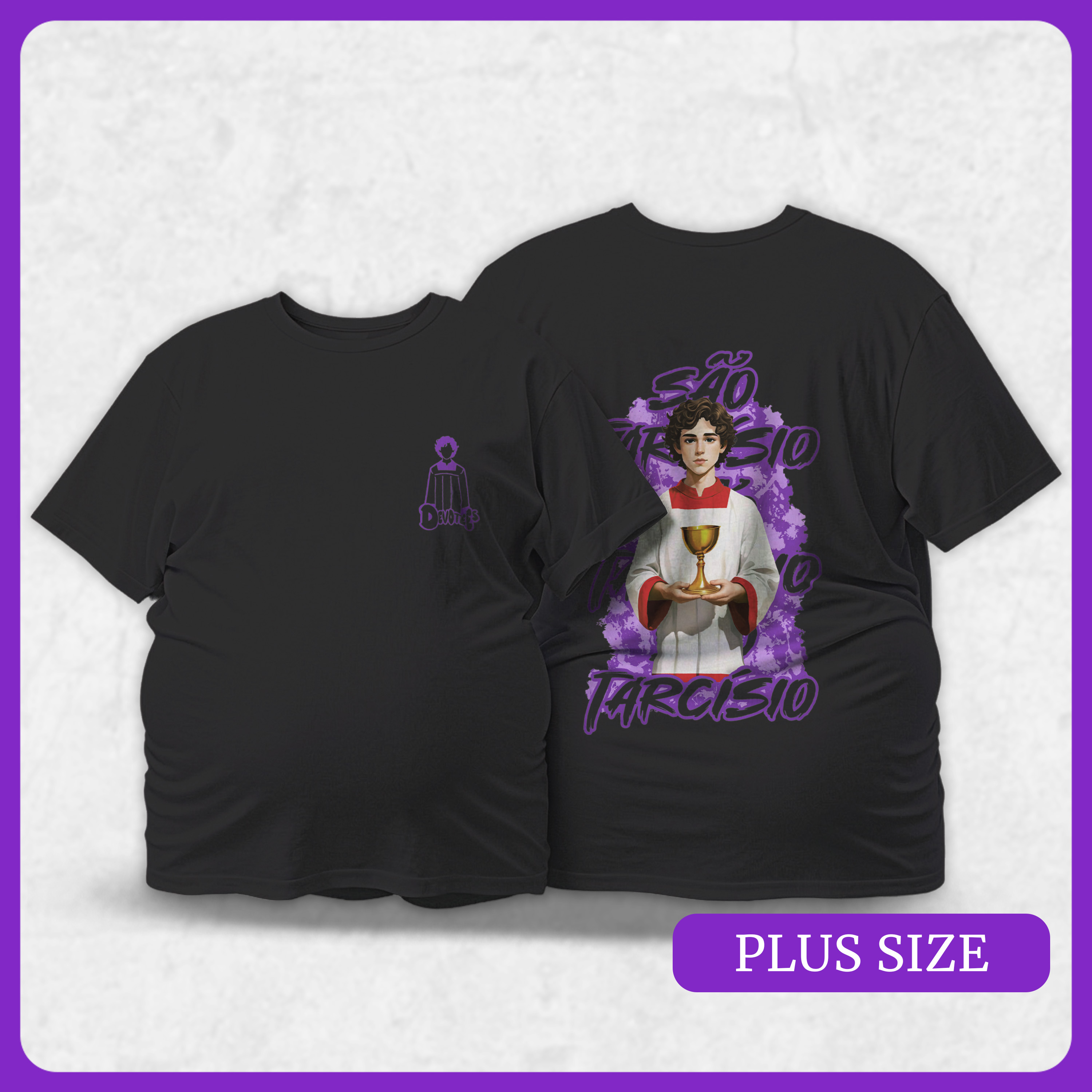 A estampa traz um fundo caótico de texturas e manchas de tinta, enquanto no centro a imagem de São Tarcísio permanece intacta, mostrando que o sagrado habita e permanece inabalável mesmo diante do caos urbano. A cor roxa destaca essa Realeza e Transcendência, lembrando que você vive para algo maior.